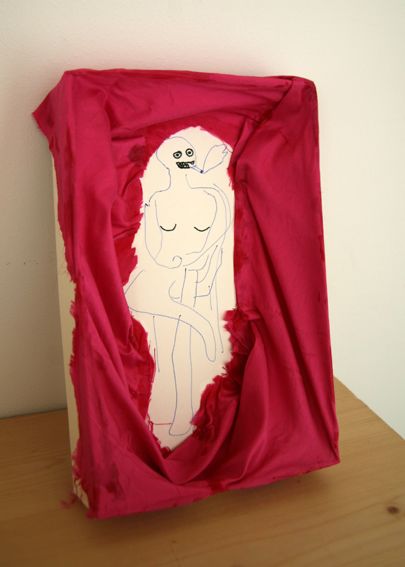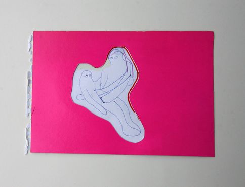 into magenta paper is cutted shape of two figures and put on white paper with drawing. they are having ritual. humans touching each others. hands and minds are floating all over the space even true the body.