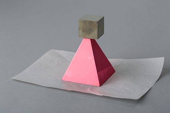swallow us, object, 10 x 20 x 14 cm, crystal pyrite/plastic pyramid/photo paper/glue, the object is placed in a room, where we do not expect it