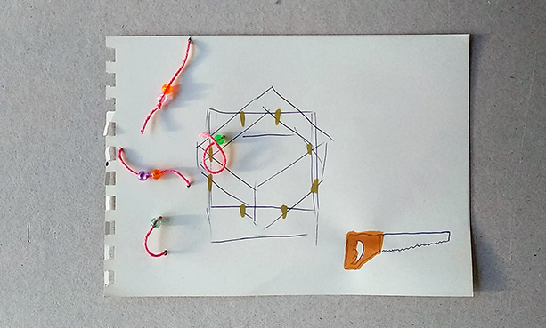 žiga žaga, paper, thread, pencil, plastic balls, 15x20cm